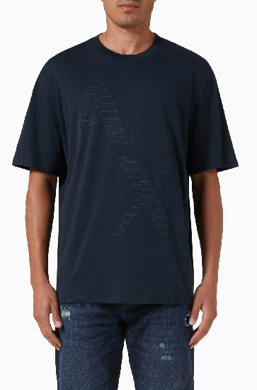 The standout design element is the “Brand Print.” Armani Exchange is known for its distinctive and often bold branding, and on this T-shirt, it typically manifests as: